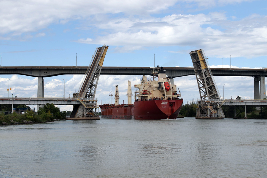 The Welland Canal connects Lake Ontario and Lake Erie through a series of eight locks, allowing ships to bypass the step of 167 feet / 51 metres at Niagara Falls.